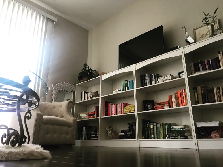 Ex: I have always had tons and tons books but I really could never figure out how to place them without it looking like a cluttered mess. So I started with 4 old target bookcases ($15 a piece) , an old mirror form a thrift store ($10). I decided to organize books by color and got inspo off of Pinterest. I separated books by general color and then just started stacking them here and there and moving them around until they look good. I used random, leftover knick knacks I’ve had or received as fillers or bookends. After 30 mins I had a decently insta worthy bookshelf/living room!