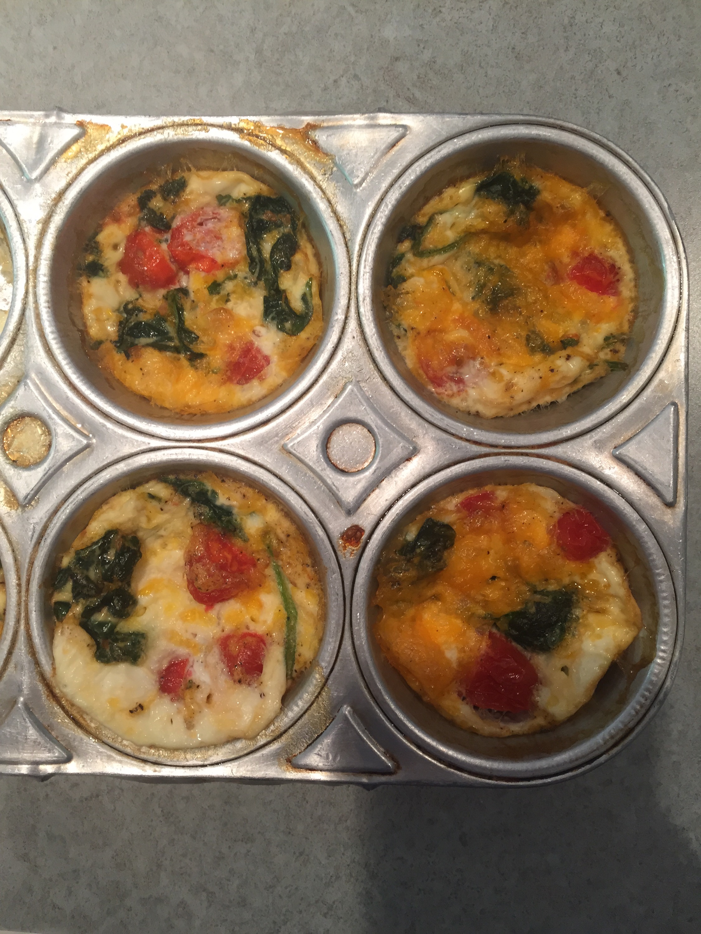 First I sprayed Pam in the muffin tins and added in the egg whites (which I seasoned with salt and pepper first). Next I cooked the tomatoes and spinach with olive oil over low heat. Then I evenly added the combination to the muffin tins. Finally I sprinkled cheese on top and baked at 350 for 35 minutes.